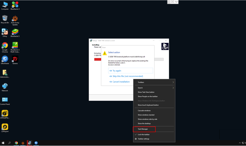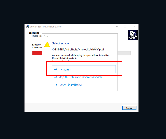 Bước 3 : Bấm Try again. Nếu không có try again bấm back rồi install