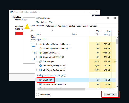 Bước 2 : Tìm tên adb.exe sau đó nhân nút End task
