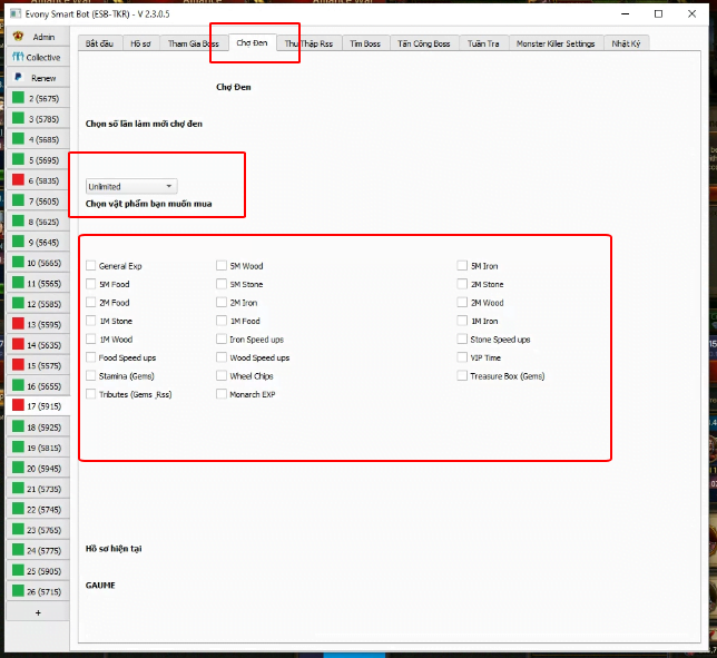 Số lần bạn muốn chợ đen làm mới và tìm kiếm các mặt hàng. - Các mặt hàng bạn muốn mua: